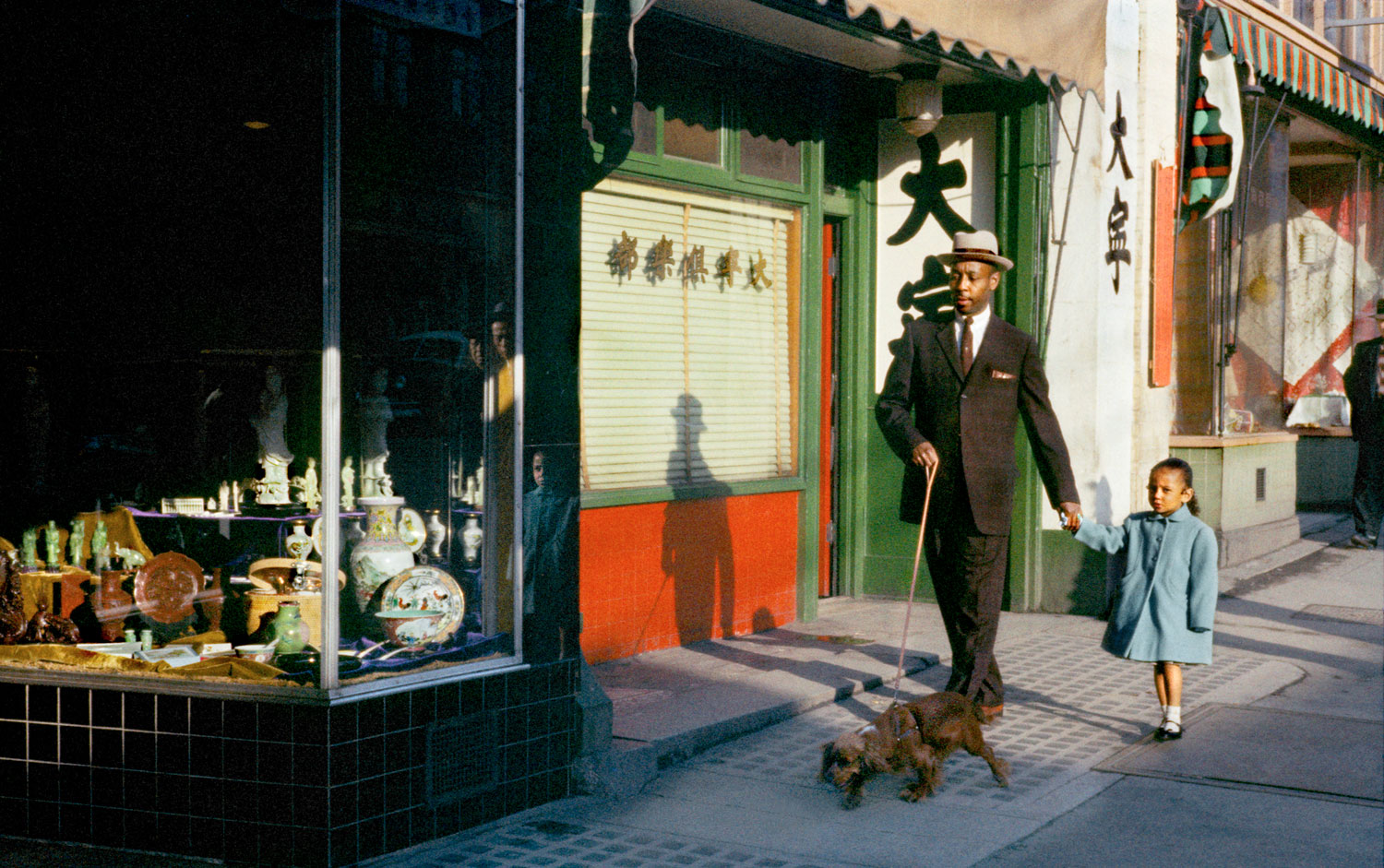 Dapper black man walking in Chinatown in 1962 with his daughter and dog:
